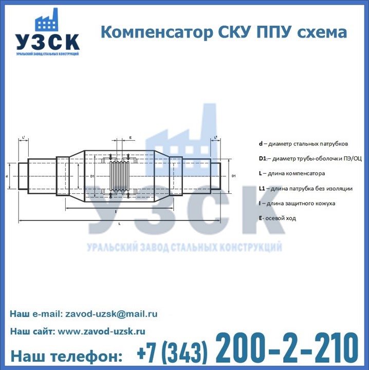Уральский Завод Стальных Конструкций в Узбекистане предлагает готовые изделия, а также вы можете приобрести компенсатор СКУ ППУ под заказ. Наш завод располагает всем необходимым оборудованием для производства нестандартных позиций компенсатора СКУ в ППУ изоляции. Завод «УЗСК» предлагает большой выбор качественных и надежных компенсаторов СКУ ППУ, полностью укомплектованных и готовых к эксплуатации. Мы гарантируем соответствие нашей продукции всем требованиям ГОСТ и ТУ, износостойкость и высокую производительность. Наше предприятие поставляет и производит оборудование, имеющее длительную гарантию и большой эксплуатационный ресурс. Если вы хотите заказать сильфонные компенсационные устройства СКУ ППУ или другое оборудование с доставкой, наши специалисты помогут рассчитать стоимость транспортных расходов и организуют доставку товара. Вы можете оформить заказ на продукцию на нашем сайте, для этого достаточно заполнить форму обратной связи.