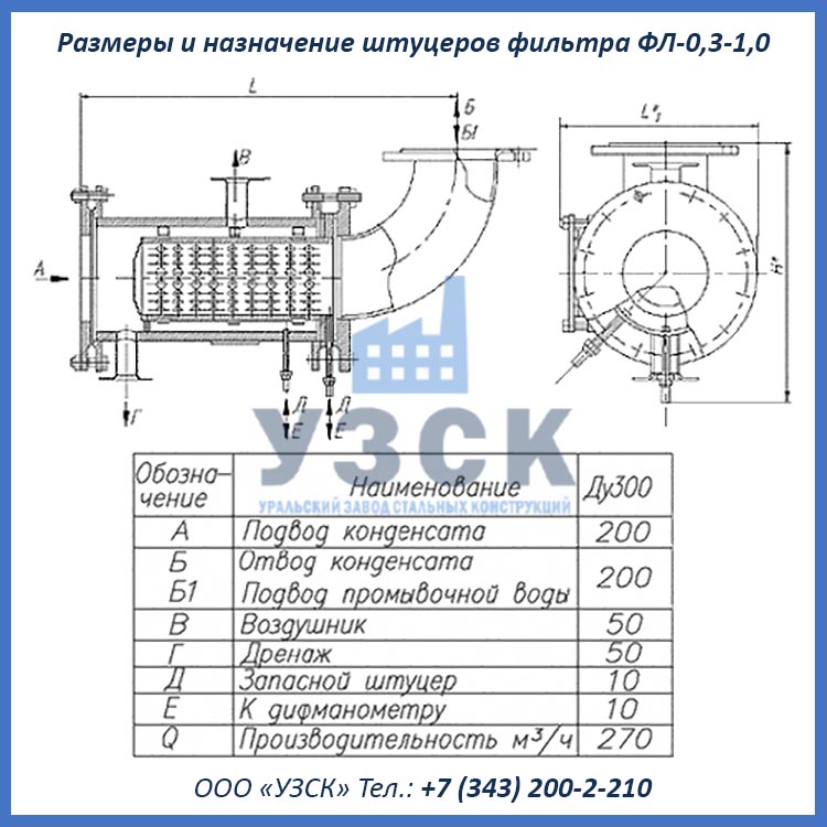 Фильтр ФЛ-0,3-1,0 представляет собой фильтр-ловушку ионитов с диаметром условного прохода 300 мм и устанавливаются на участок трубопровода после ионитного фильтр. Назначением фильтра ловушки ФЛ-0,3-1,0 является удаление из уже очищенной воды случайно попавших частиц фильтрующих материалов (ионитов).